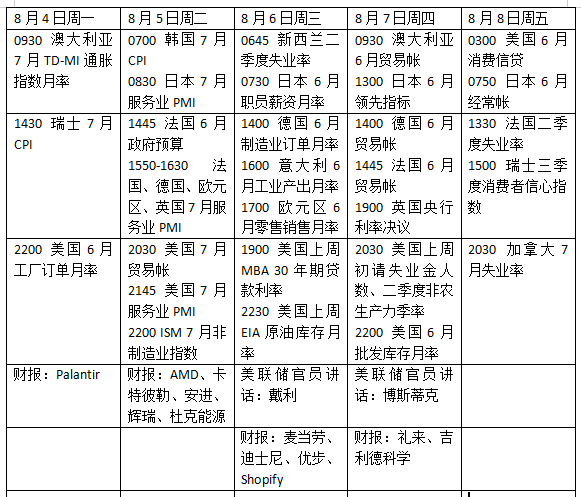 关税大部分将于8月7日生效,有关关税协议的进一步消息也成为焦点。央行方面,英国央行料重启降息,日本央行会议纪要将展示关税对经济影响的评估。
